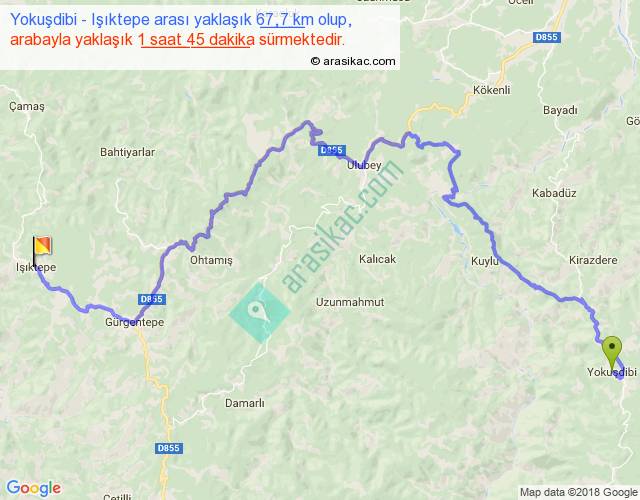 Yokuşdibi - Işıktepe arası yaklaşık olarak 90 km/h ile yukarıda belirtilen sürede olup, iki yerin kuş uçuşu uzaklığı (mesafesi) 34'dir. Yolculuk otobüsle 2 saat 16 dakika sürmektedir.