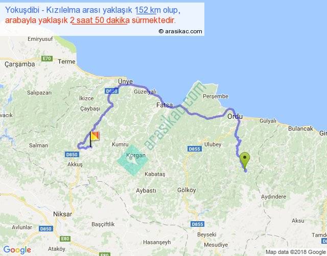 Yokuşdibi - Kızılelma arası yaklaşık olarak 90 km/h ile yukarıda belirtilen sürede olup, iki yerin kuş uçuşu uzaklığı (mesafesi) 70'dir. Yolculuk otobüsle 3 saat 41 dakika sürmektedir.