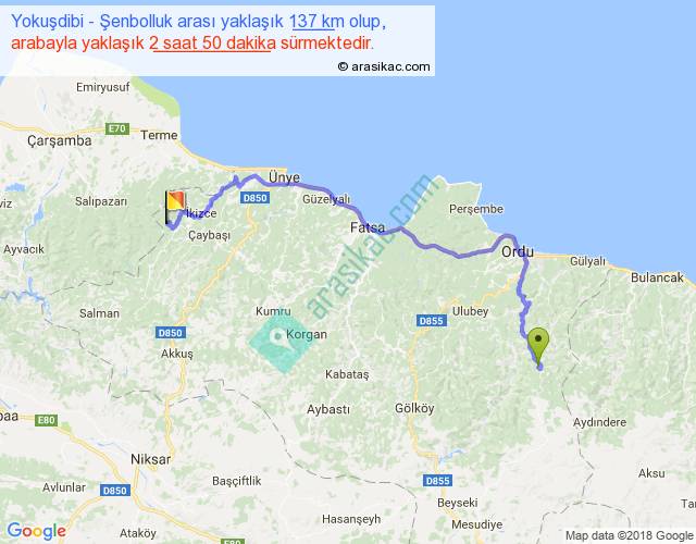 Yokuşdibi - Şenbolluk arası yaklaşık olarak 90 km/h ile yukarıda belirtilen sürede olup, iki yerin kuş uçuşu uzaklığı (mesafesi) 84'dir. Yolculuk otobüsle 3 saat 41 dakika sürmektedir.