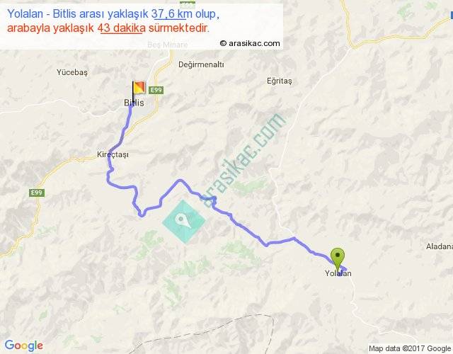 Yolalan - Bitlis arası yaklaşık olarak 90 km/h ile yukarıda belirtilen sürede olup, iki yerin kuş uçuşu uzaklığı (mesafesi) 22'dir. Yolculuk otobüsle 55 dakika sürmektedir.