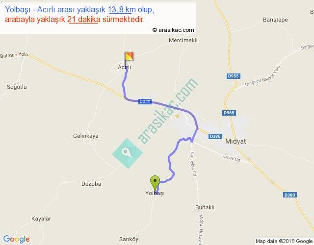 Yolbaşı - Acırlı arası yaklaşık olarak 90 km/h ile yukarıda belirtilen sürede olup, iki yerin kuş uçuşu uzaklığı (mesafesi) 8'dir. Yolculuk otobüsle 27 dakika sürmektedir.