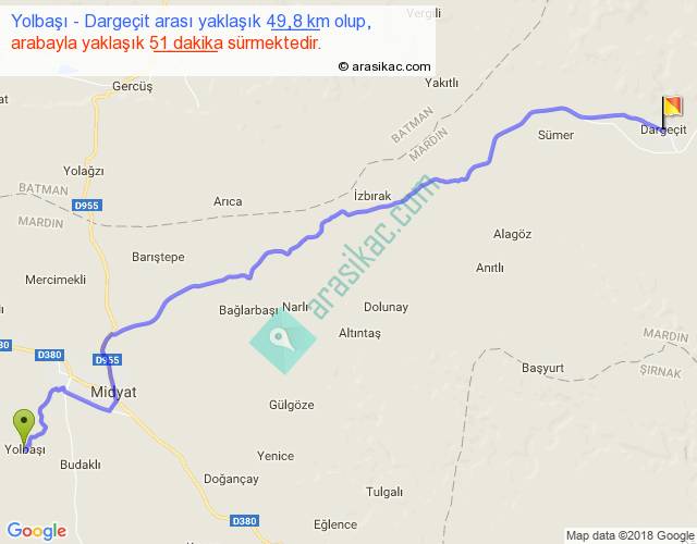 Yolbaşı - Dargeçit arası yaklaşık olarak 90 km/h ile yukarıda belirtilen sürede olup, iki yerin kuş uçuşu uzaklığı (mesafesi) 40'dir. Yolculuk otobüsle 1 saat 6 dakika sürmektedir.