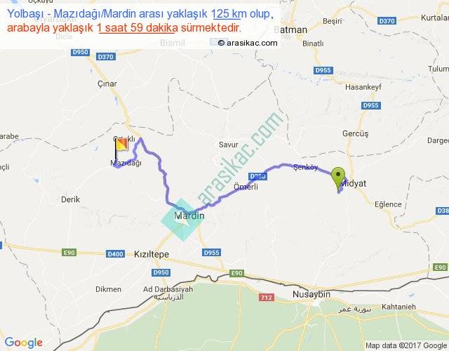 Yolbaşı - Mazıdağı Mardin arası yaklaşık olarak 90 km/h ile yukarıda belirtilen sürede olup, iki yerin kuş uçuşu uzaklığı (mesafesi) 77'dir. Yolculuk otobüsle 2 saat 34 dakika sürmektedir.