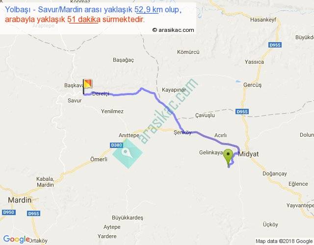 Yolbaşı - Savur Mardin arası yaklaşık olarak 90 km/h ile yukarıda belirtilen sürede olup, iki yerin kuş uçuşu uzaklığı (mesafesi) 40'dir. Yolculuk otobüsle 1 saat 6 dakika sürmektedir.