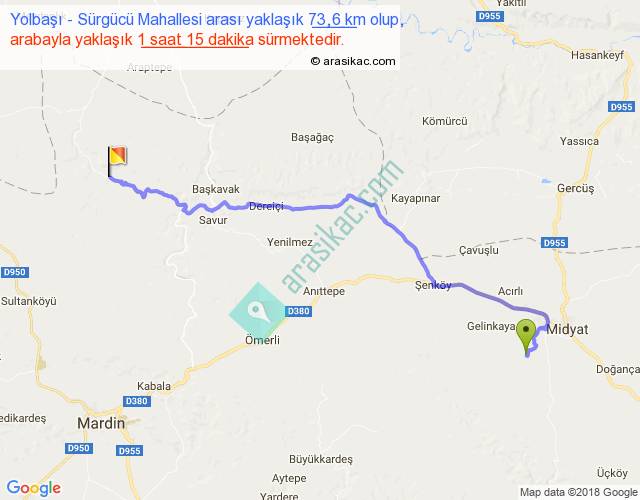 Yolbaşı - Sürgücü Mahallesi arası yaklaşık olarak 90 km/h ile yukarıda belirtilen sürede olup, iki yerin kuş uçuşu uzaklığı (mesafesi) 55'dir. Yolculuk otobüsle 1 saat 37 dakika sürmektedir.