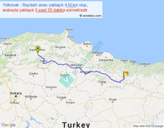 Yolkonak - Baydarlı arası yaklaşık olarak 90 km/h ile yukarıda belirtilen sürede olup, iki yerin kuş uçuşu uzaklığı (mesafesi) 320'dir. Eğer belirtilen yerler arasında uçak seferi var ise bu süre uçakla 29 dakika'ya kadar düşebilir. Yolculuk otobüsle 7 saat 15 dakika sürmektedir.