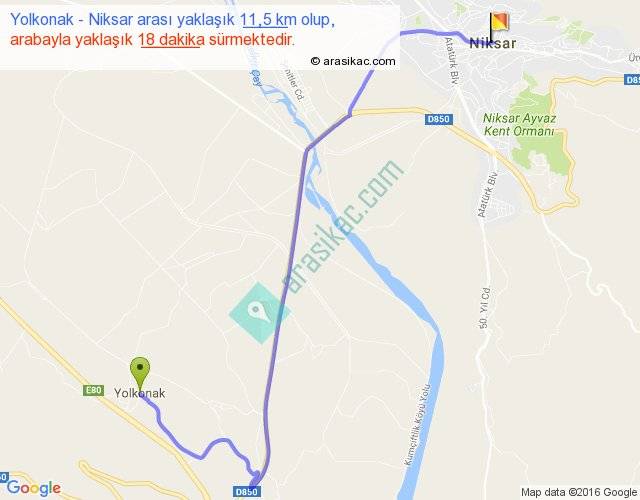Yolkonak - Niksar arası yaklaşık olarak 90 km/h ile yukarıda belirtilen sürede olup, iki yerin kuş uçuşu uzaklığı (mesafesi) 7'dir. Yolculuk otobüsle 23 dakika sürmektedir.