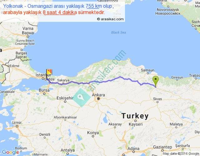 Yolkonak - Osmangazi arası yaklaşık olarak 90 km/h ile yukarıda belirtilen sürede olup, iki yerin kuş uçuşu uzaklığı (mesafesi) 641'dir. Eğer belirtilen yerler arasında uçak seferi var ise bu süre uçakla 59 dakika'ya kadar düşebilir. Yolculuk otobüsle 10 saat 29 dakika sürmektedir.