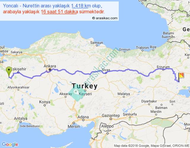 Yoncalı - Nurettin arası yaklaşık olarak 90 km/h ile yukarıda belirtilen sürede olup, iki yerin kuş uçuşu uzaklığı (mesafesi) 1074'dir. Eğer belirtilen yerler arasında uçak seferi var ise bu süre uçakla 1 saat 39 dakika'ya kadar düşebilir. Yolculuk otobüsle 21 saat 54 dakika sürmektedir.