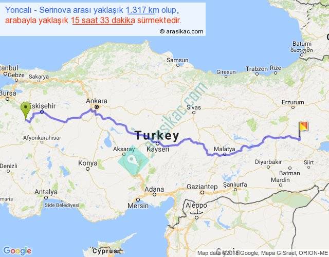 Yoncalı - Serinova arası yaklaşık olarak 90 km/h ile yukarıda belirtilen sürede olup, iki yerin kuş uçuşu uzaklığı (mesafesi) 1003'dir. Eğer belirtilen yerler arasında uçak seferi var ise bu süre uçakla 1 saat 32 dakika'ya kadar düşebilir. Yolculuk otobüsle 20 saat 12 dakika sürmektedir.