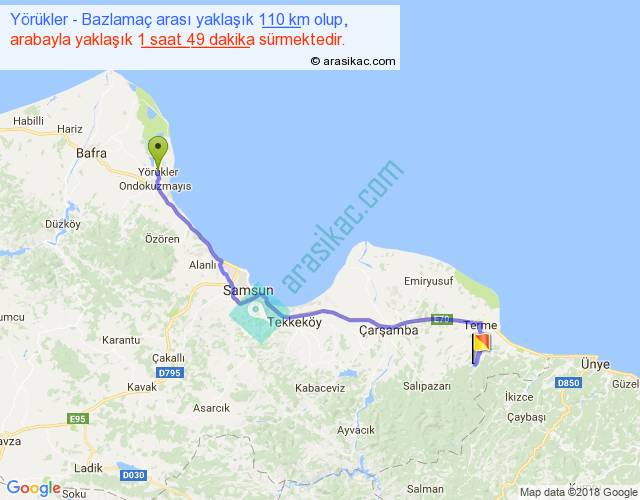 Yörükler - Bazlamaç arası yaklaşık olarak 90 km/h ile yukarıda belirtilen sürede olup, iki yerin kuş uçuşu uzaklığı (mesafesi) 84'dir. Yolculuk otobüsle 2 saat 21 dakika sürmektedir.