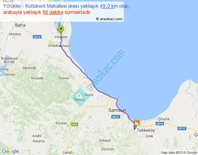 Yörükler - Kutlukent Mahallesi arası yaklaşık olarak 90 km/h ile yukarıda belirtilen sürede olup, iki yerin kuş uçuşu uzaklığı (mesafesi) 43'dir. Yolculuk otobüsle 1 saat 15 dakika sürmektedir.