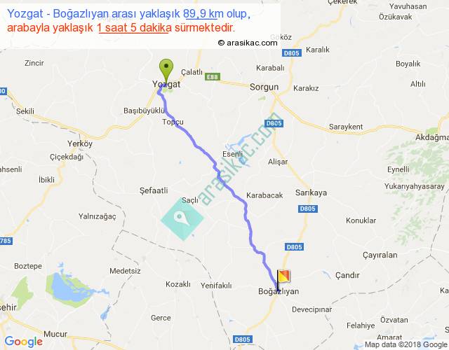 Yozgat - Boğazlıyan arası yaklaşık olarak 90 km/h ile yukarıda belirtilen sürede olup, iki yerin kuş uçuşu uzaklığı (mesafesi) 79'dir. Yolculuk otobüsle 1 saat 20 dakika sürmektedir.
