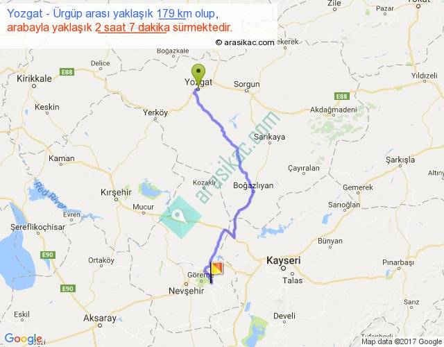 Yozgat - Ürgüp arası yaklaşık olarak 90 km/h ile yukarıda belirtilen sürede olup, iki yerin kuş uçuşu uzaklığı (mesafesi) 132'dir. Yolculuk otobüsle 2 saat 45 dakika sürmektedir.