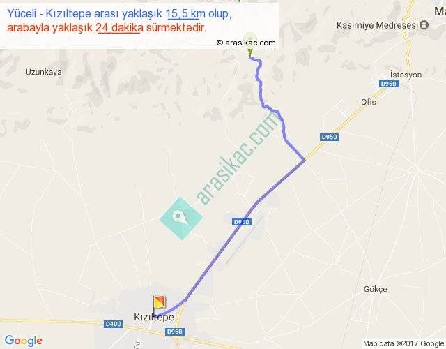 Yüceli - Kızıltepe arası yaklaşık olarak 90 km/h ile yukarıda belirtilen sürede olup, iki yerin kuş uçuşu uzaklığı (mesafesi) 12'dir. Yolculuk otobüsle 31 dakika sürmektedir.