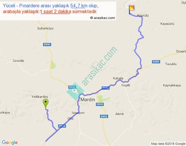 Yüceli - Pınardere arası yaklaşık olarak 90 km/h ile yukarıda belirtilen sürede olup, iki yerin kuş uçuşu uzaklığı (mesafesi) 26'dir. Yolculuk otobüsle 1 saat 20 dakika sürmektedir.