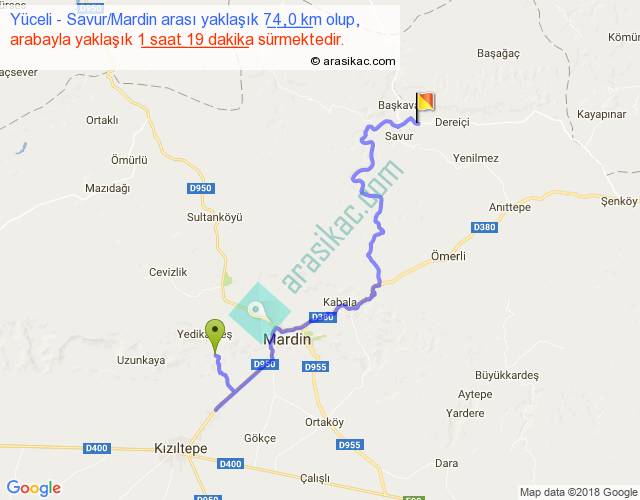Yüceli - Savur Mardin arası yaklaşık olarak 90 km/h ile yukarıda belirtilen sürede olup, iki yerin kuş uçuşu uzaklığı (mesafesi) 37'dir. Yolculuk otobüsle 1 saat 42 dakika sürmektedir.