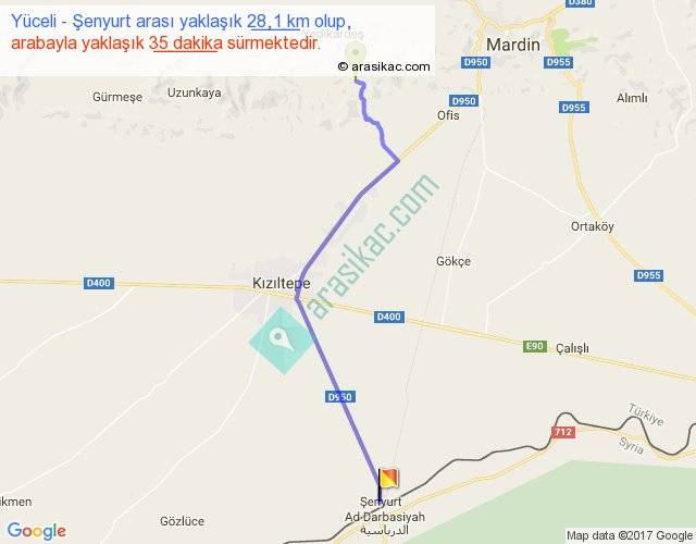 Yüceli - Şenyurt arası yaklaşık olarak 90 km/h ile yukarıda belirtilen sürede olup, iki yerin kuş uçuşu uzaklığı (mesafesi) 23'dir. Yolculuk otobüsle 45 dakika sürmektedir.