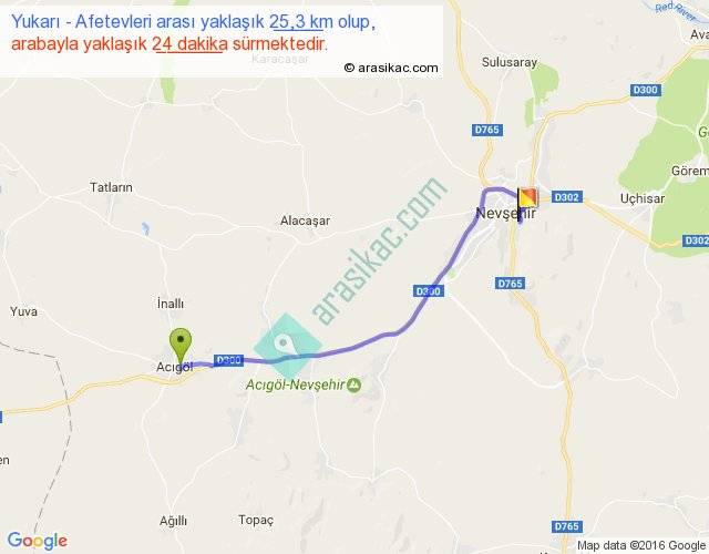 Yukarı - Afetevleri arası yaklaşık olarak 90 km/h ile yukarıda belirtilen sürede olup, iki yerin kuş uçuşu uzaklığı (mesafesi) 20'dir. Yolculuk otobüsle 31 dakika sürmektedir.