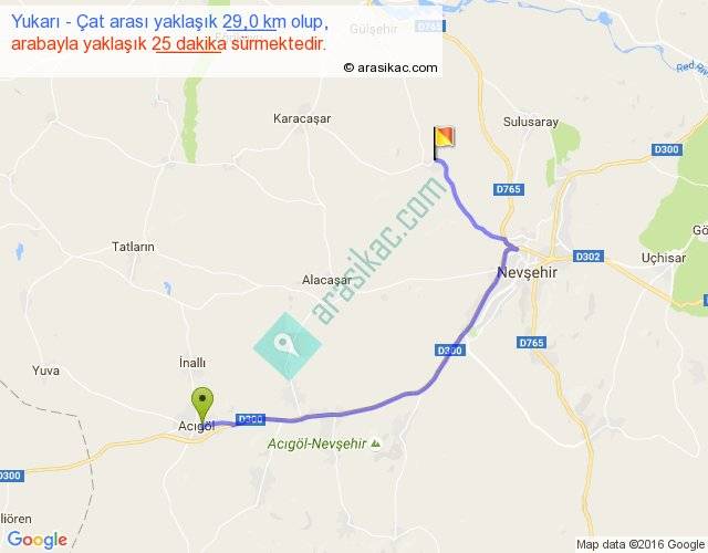 Yukarı - Çat arası yaklaşık olarak 90 km/h ile yukarıda belirtilen sürede olup, iki yerin kuş uçuşu uzaklığı (mesafesi) 19'dir. Yolculuk otobüsle 32 dakika sürmektedir.