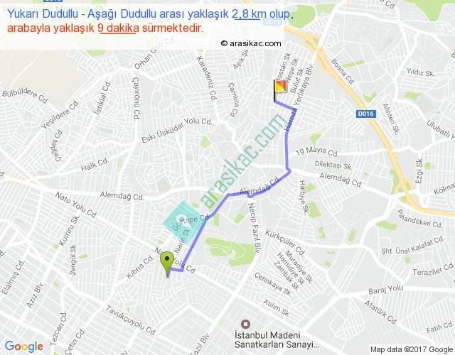 Yukarı Dudullu - Aşağı Dudullu arası yaklaşık olarak 90 km/h ile yukarıda belirtilen sürede olup, iki yerin kuş uçuşu uzaklığı (mesafesi) 2'dir. Yolculuk otobüsle 11 dakika sürmektedir.