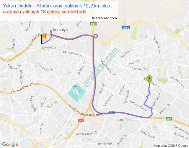 Yukarı Dudullu - Atatürk arası yaklaşık olarak 90 km/h ile yukarıda belirtilen sürede olup, iki yerin kuş uçuşu uzaklığı (mesafesi) 6'dir. Yolculuk otobüsle 23 dakika sürmektedir.