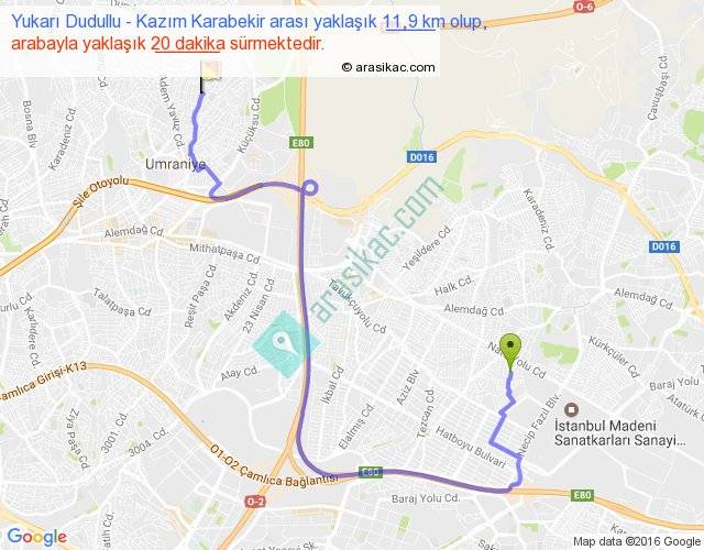 Yukarı Dudullu - Kazım Karabekir arası yaklaşık olarak 90 km/h ile yukarıda belirtilen sürede olup, iki yerin kuş uçuşu uzaklığı (mesafesi) 5'dir. Yolculuk otobüsle 26 dakika sürmektedir.
