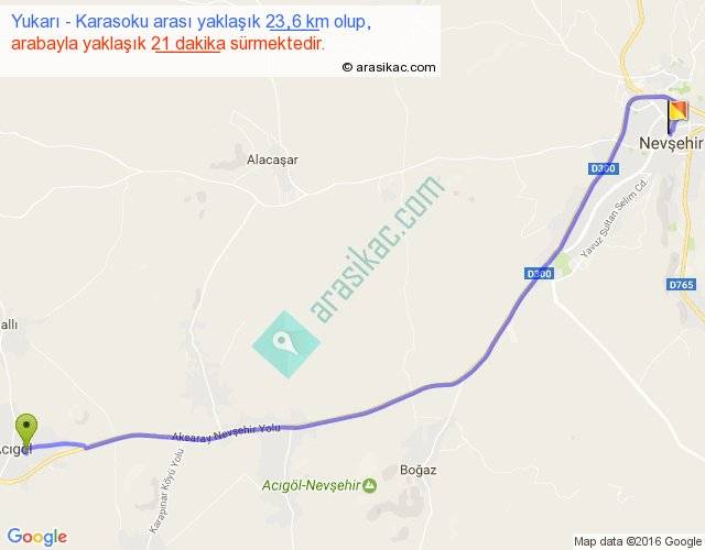 Yukarı - Karasoku arası yaklaşık olarak 90 km/h ile yukarıda belirtilen sürede olup, iki yerin kuş uçuşu uzaklığı (mesafesi) 19'dir. Yolculuk otobüsle 27 dakika sürmektedir.