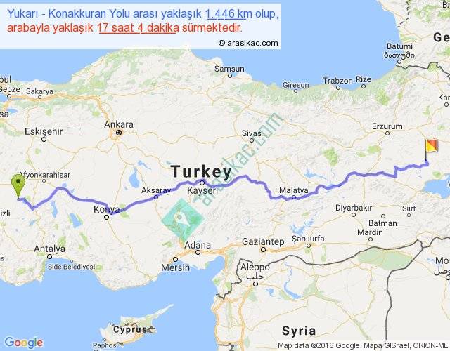 Yukarı - Konakkuran Yolu arası yaklaşık olarak 90 km/h ile yukarıda belirtilen sürede olup, iki yerin kuş uçuşu uzaklığı (mesafesi) 1102'dir. Eğer belirtilen yerler arasında uçak seferi var ise bu süre uçakla 1 saat 41 dakika'ya kadar düşebilir. Yolculuk otobüsle 22 saat 11 dakika sürmektedir.