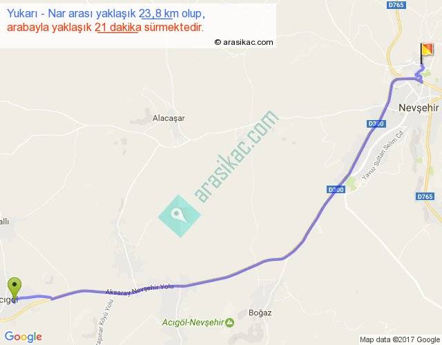 Yukarı - Nar arası yaklaşık olarak 90 km/h ile yukarıda belirtilen sürede olup, iki yerin kuş uçuşu uzaklığı (mesafesi) 20'dir. Yolculuk otobüsle 27 dakika sürmektedir.