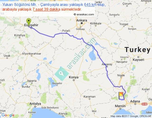 Yukarı Söğütönü Mh. - Çamlıyayla arası yaklaşık olarak 90 km/h ile yukarıda belirtilen sürede olup, iki yerin kuş uçuşu uzaklığı (mesafesi) 465'dir. Eğer belirtilen yerler arasında uçak seferi var ise bu süre uçakla 42 dakika'ya kadar düşebilir. Yolculuk otobüsle 9 saat 56 dakika sürmektedir.