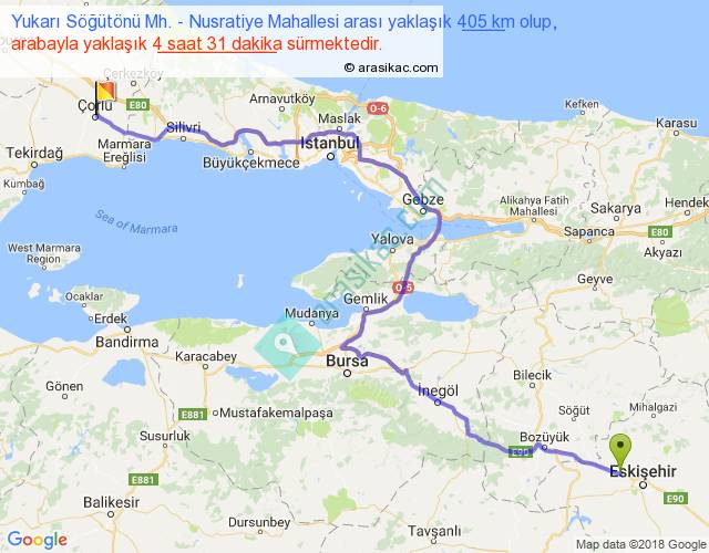 Yukarı Söğütönü Mh. - Nusratiye Mahallesi arası yaklaşık olarak 90 km/h ile yukarıda belirtilen sürede olup, iki yerin kuş uçuşu uzaklığı (mesafesi) 264'dir. Eğer belirtilen yerler arasında uçak seferi var ise bu süre uçakla 24 dakika'ya kadar düşebilir. Yolculuk otobüsle 5 saat 52 dakika sürmektedir.