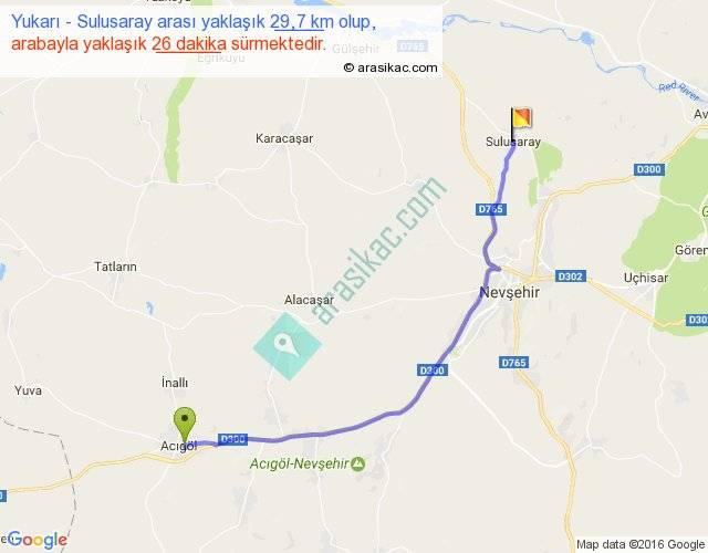 Yukarı - Sulusaray arası yaklaşık olarak 90 km/h ile yukarıda belirtilen sürede olup, iki yerin kuş uçuşu uzaklığı (mesafesi) 24'dir. Yolculuk otobüsle 33 dakika sürmektedir.