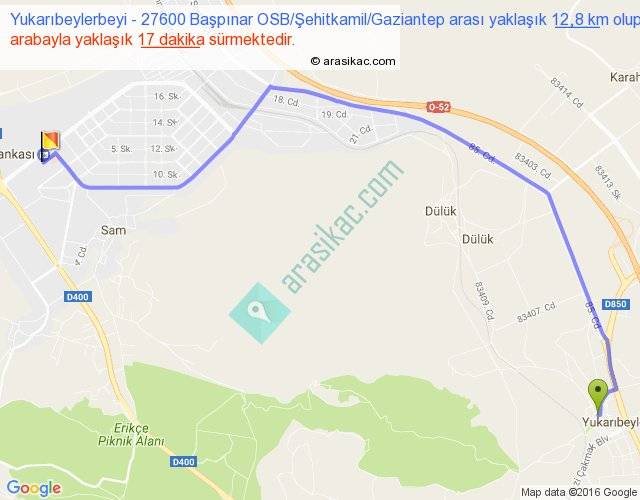 Yukarıbeylerbeyi - 27600 Başpınar OSB Şehitkamil Gaziantep arası yaklaşık olarak 90 km/h ile yukarıda belirtilen sürede olup, iki yerin kuş uçuşu uzaklığı (mesafesi) 9'dir. Yolculuk otobüsle 22 dakika sürmektedir.