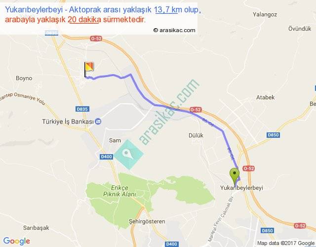 Yukarıbeylerbeyi - Aktoprak arası yaklaşık olarak 90 km/h ile yukarıda belirtilen sürede olup, iki yerin kuş uçuşu uzaklığı (mesafesi) 11'dir. Yolculuk otobüsle 26 dakika sürmektedir.