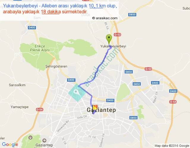 Yukarıbeylerbeyi - Alleben arası yaklaşık olarak 90 km/h ile yukarıda belirtilen sürede olup, iki yerin kuş uçuşu uzaklığı (mesafesi) 7'dir. Yolculuk otobüsle 23 dakika sürmektedir.