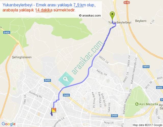 Yukarıbeylerbeyi - Emek arası yaklaşık olarak 90 km/h ile yukarıda belirtilen sürede olup, iki yerin kuş uçuşu uzaklığı (mesafesi) 7'dir. Yolculuk otobüsle 18 dakika sürmektedir.