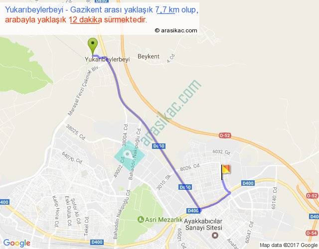 Yukarıbeylerbeyi - Gazikent arası yaklaşık olarak 90 km/h ile yukarıda belirtilen sürede olup, iki yerin kuş uçuşu uzaklığı (mesafesi) 5'dir. Yolculuk otobüsle 15 dakika sürmektedir.