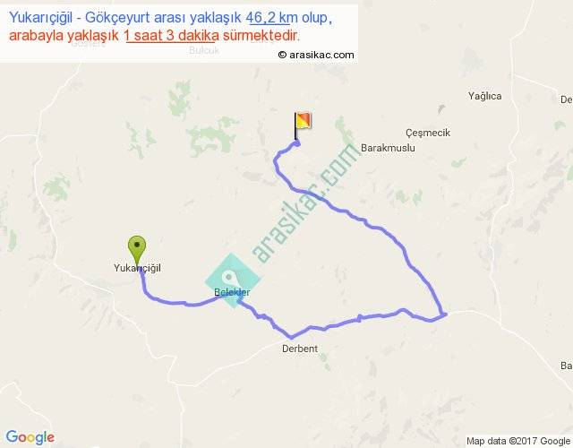 Yukarıçiğil - Gökçeyurt arası yaklaşık olarak 90 km/h ile yukarıda belirtilen sürede olup, iki yerin kuş uçuşu uzaklığı (mesafesi) 14'dir. Yolculuk otobüsle 1 saat 21 dakika sürmektedir.