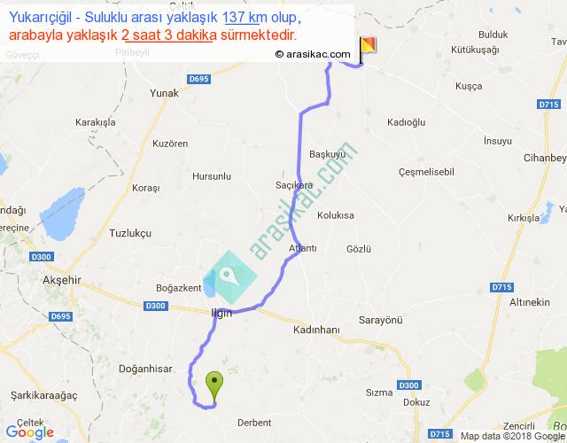 Yukarıçiğil - Suluklu arası yaklaşık olarak 90 km/h ile yukarıda belirtilen sürede olup, iki yerin kuş uçuşu uzaklığı (mesafesi) 99'dir. Yolculuk otobüsle 2 saat 39 dakika sürmektedir.