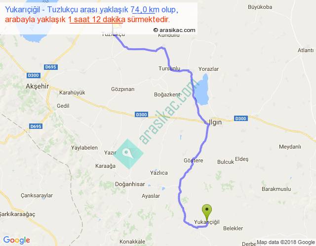 Yukarıçiğil - Tuzlukçu arası yaklaşık olarak 90 km/h ile yukarıda belirtilen sürede olup, iki yerin kuş uçuşu uzaklığı (mesafesi) 51'dir. Yolculuk otobüsle 1 saat 33 dakika sürmektedir.