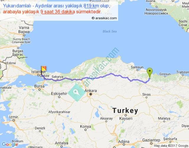 Yukarıdamlalı - Aydınlar arası yaklaşık olarak 90 km/h ile yukarıda belirtilen sürede olup, iki yerin kuş uçuşu uzaklığı (mesafesi) 671'dir. Eğer belirtilen yerler arasında uçak seferi var ise bu süre uçakla 1 saat 01 dakika'ya kadar düşebilir. Yolculuk otobüsle 12 saat 28 dakika sürmektedir.