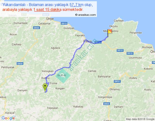 Yukarıdamlalı - Bolaman arası yaklaşık olarak 90 km/h ile yukarıda belirtilen sürede olup, iki yerin kuş uçuşu uzaklığı (mesafesi) 40'dir. Yolculuk otobüsle 1 saat 37 dakika sürmektedir.