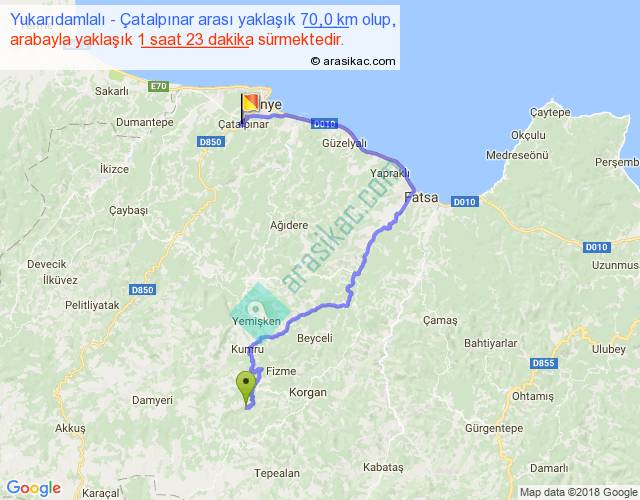 Yukarıdamlalı - Çatalpınar arası yaklaşık olarak 90 km/h ile yukarıda belirtilen sürede olup, iki yerin kuş uçuşu uzaklığı (mesafesi) 32'dir. Yolculuk otobüsle 1 saat 47 dakika sürmektedir.
