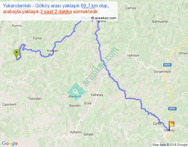 Yukarıdamlalı - Gölköy arası yaklaşık olarak 90 km/h ile yukarıda belirtilen sürede olup, iki yerin kuş uçuşu uzaklığı (mesafesi) 33'dir. Yolculuk otobüsle 2 saat 38 dakika sürmektedir.