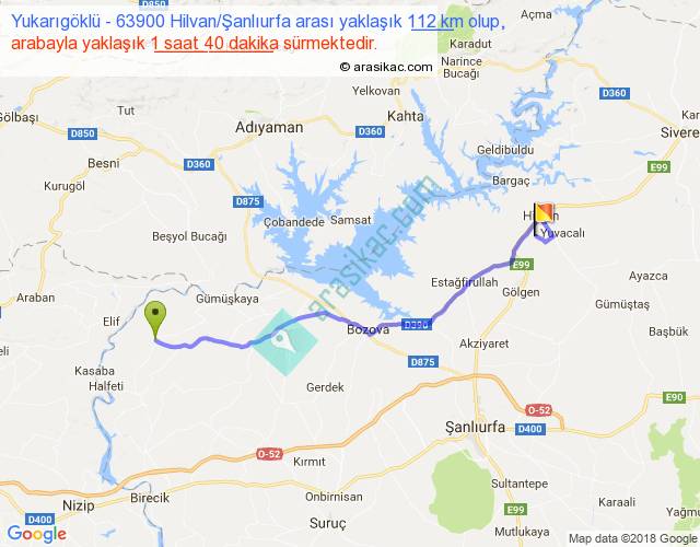 Yukarıgöklü - 63900 Hilvan Şanlıurfa arası yaklaşık olarak 90 km/h ile yukarıda belirtilen sürede olup, iki yerin kuş uçuşu uzaklığı (mesafesi) 87'dir. Yolculuk otobüsle 2 saat 10 dakika sürmektedir.