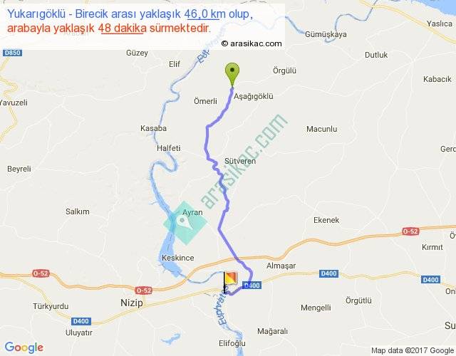 Yukarıgöklü - Birecik arası yaklaşık olarak 90 km/h ile yukarıda belirtilen sürede olup, iki yerin kuş uçuşu uzaklığı (mesafesi) 35'dir. Yolculuk otobüsle 1 saat 2 dakika sürmektedir.