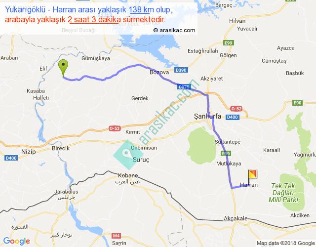 Yukarıgöklü - Harran arası yaklaşık olarak 90 km/h ile yukarıda belirtilen sürede olup, iki yerin kuş uçuşu uzaklığı (mesafesi) 105'dir. Yolculuk otobüsle 2 saat 39 dakika sürmektedir.
