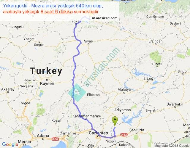 Yukarıgöklü - Mezra arası yaklaşık olarak 90 km/h ile yukarıda belirtilen sürede olup, iki yerin kuş uçuşu uzaklığı (mesafesi) 352'dir. Eğer belirtilen yerler arasında uçak seferi var ise bu süre uçakla 32 dakika'ya kadar düşebilir. Yolculuk otobüsle 10 saat 31 dakika sürmektedir.