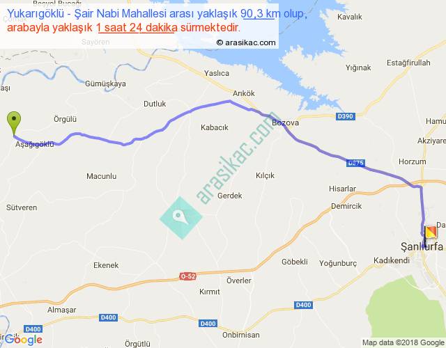 Yukarıgöklü - Şair Nabi Mahallesi arası yaklaşık olarak 90 km/h ile yukarıda belirtilen sürede olup, iki yerin kuş uçuşu uzaklığı (mesafesi) 74'dir. Yolculuk otobüsle 1 saat 49 dakika sürmektedir.